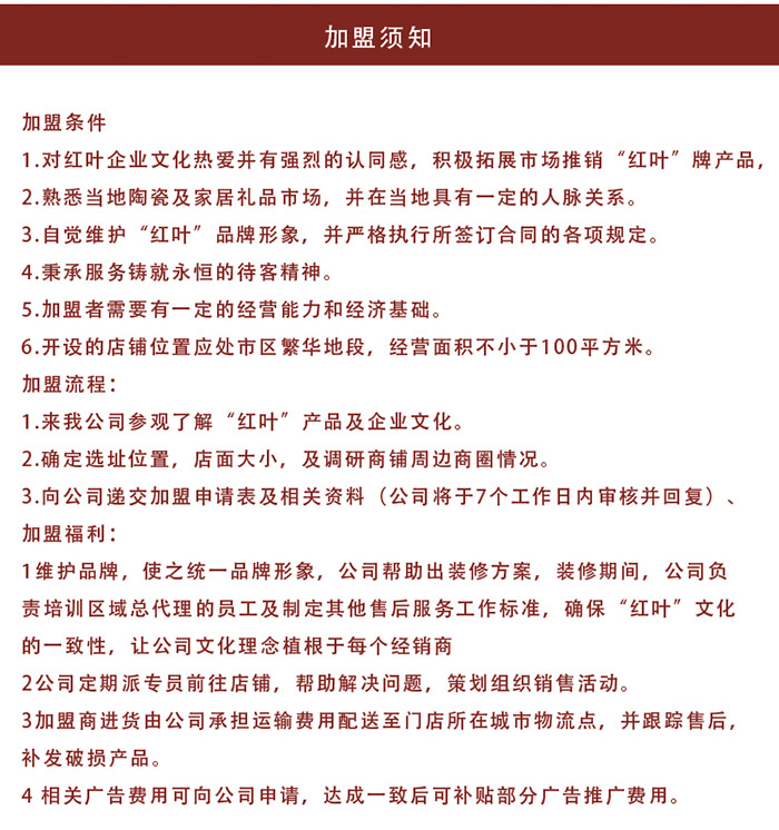 良禽擇木而棲,我們熱忱歡迎各界熱愛紅葉陶瓷且備具一定經濟實力的有志之士,加盟“紅葉”,與我們一起共同創(chuàng)造景德鎮(zhèn)紅葉陶瓷股份有限公司的美好明天。