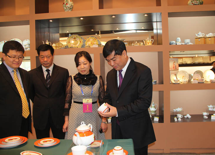 全國(guó)人大常委會(huì)副委員長(zhǎng)韓啟德在我公司展館參觀,對(duì)我公司在全國(guó)青花玲瓏及青花日用陶瓷器形與裝飾設(shè)計(jì)大賽金獎(jiǎng)作品《憶漢》非常感興趣
