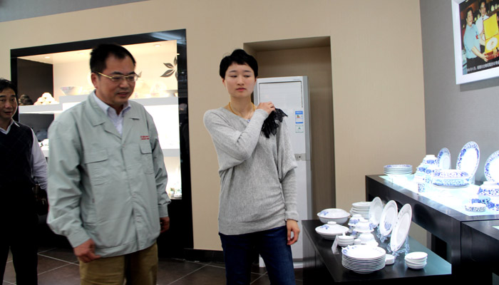 公司總經(jīng)理夏躍中在給吳靜鈺介紹手繪陶瓷